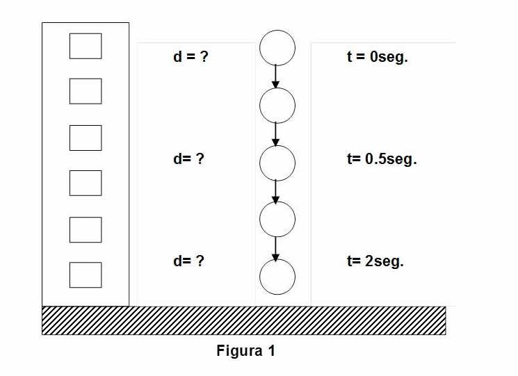 Se deja caer un objeto desde la azotea de un edificio, como se muestra en la figura 1, dada su velocidad inicial igual a cero, encontrar su posición o distancia desplazada hacia abajo después de 0 seg., .5 seg., 1 seg., 1.5 seg., 2 seg., 2.5 seg., 3 seg.